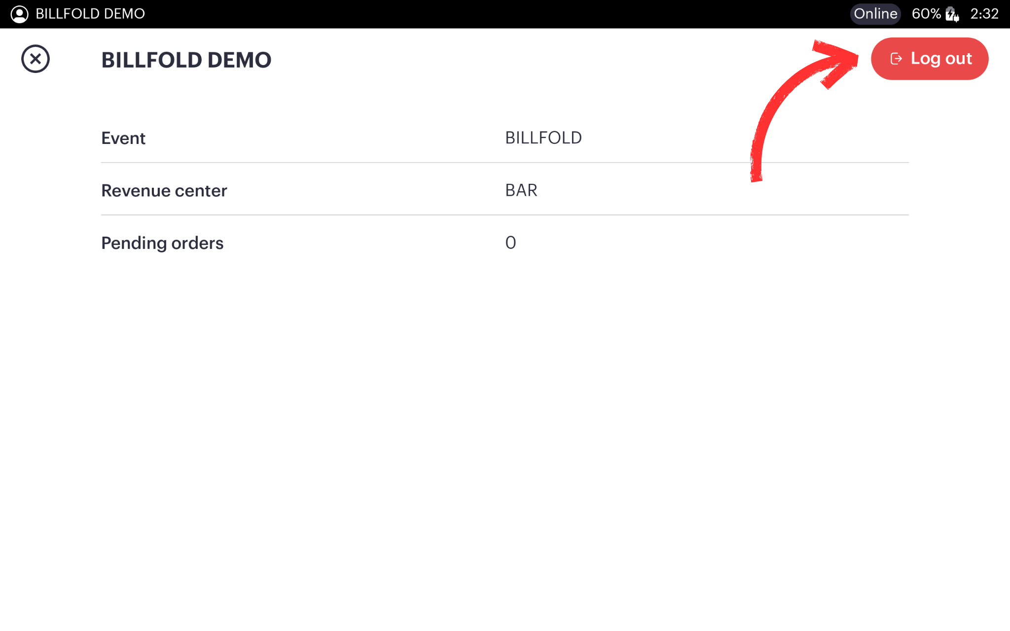 From anywhere within the Bartender app, select the employee name on the screen, then select the “log out” button.