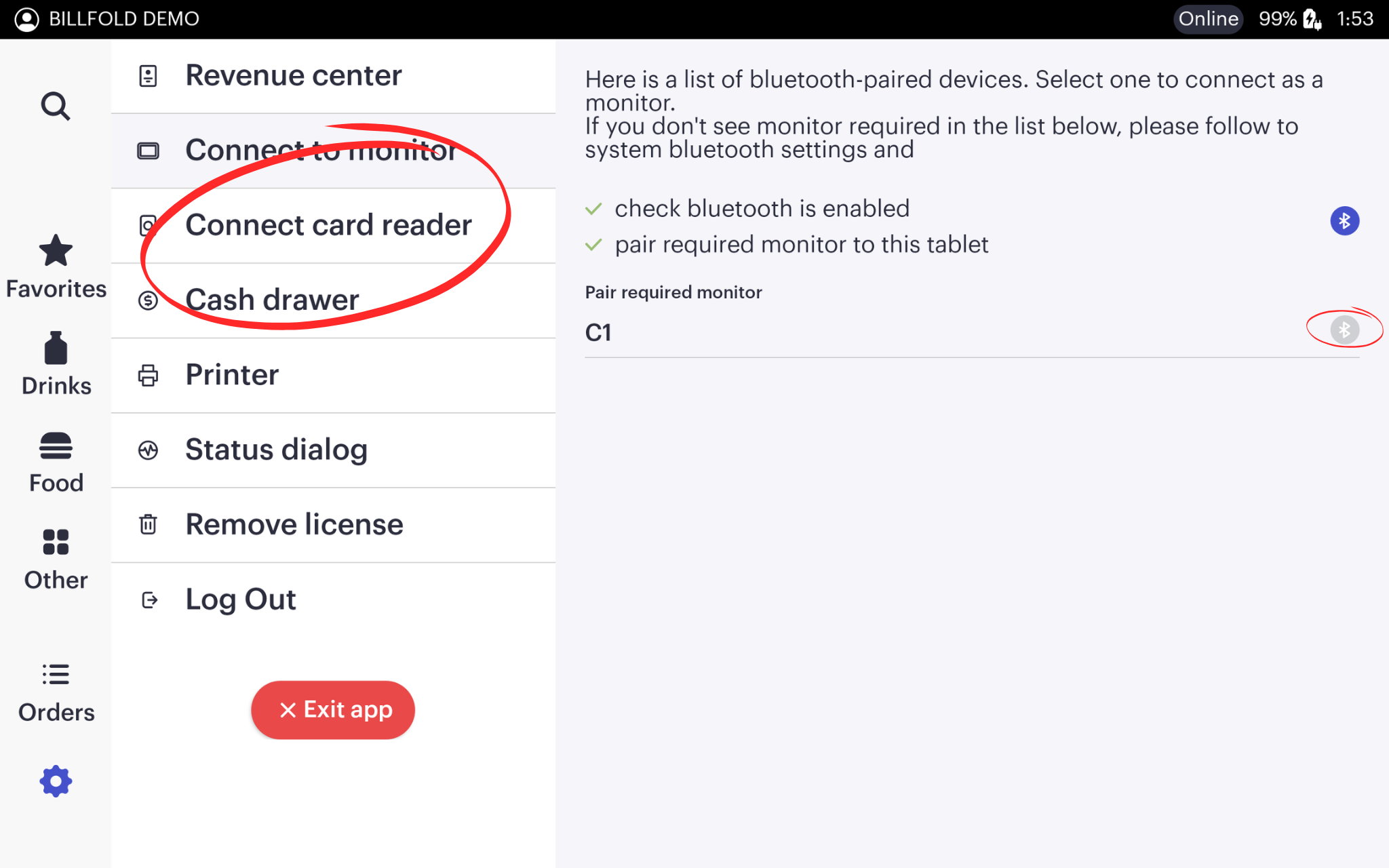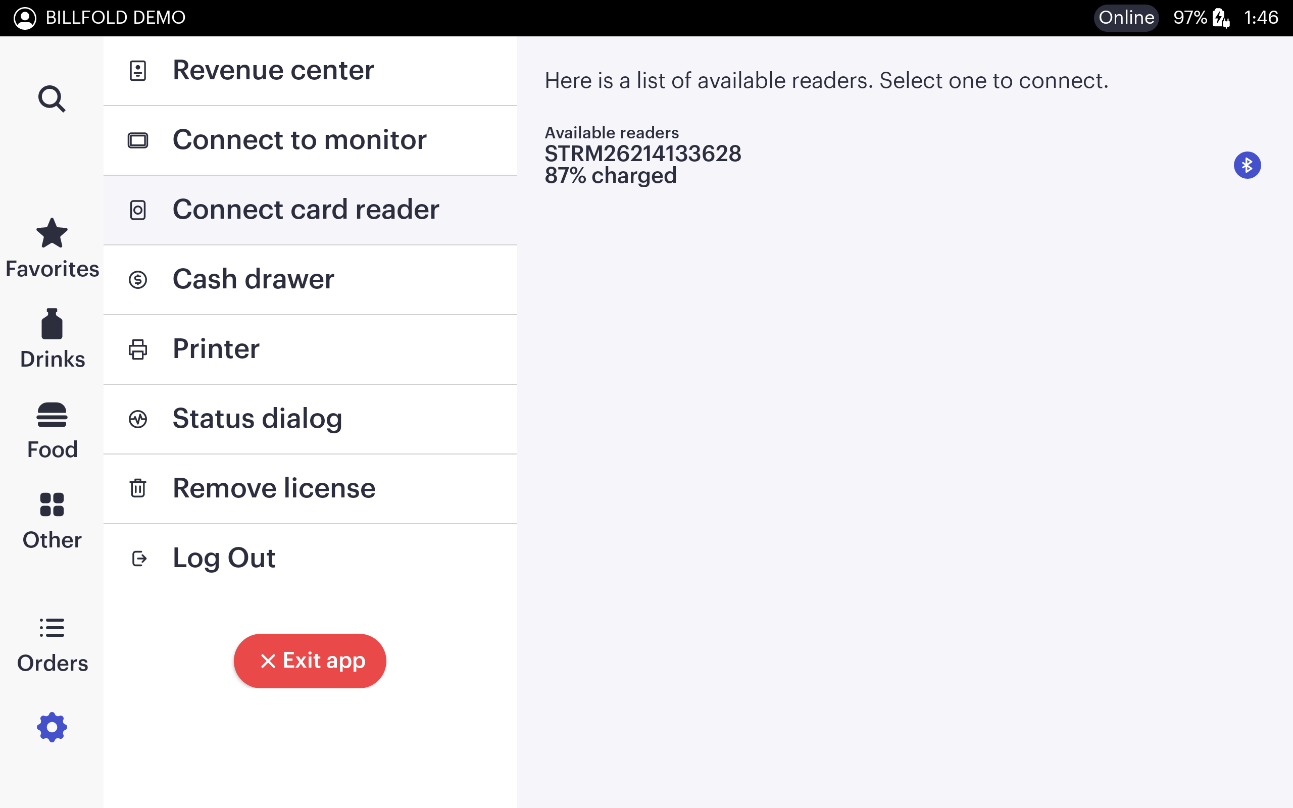 When the card reader has been successfully connected, the Bluetooth icon will turn blue and report card reader battery status
