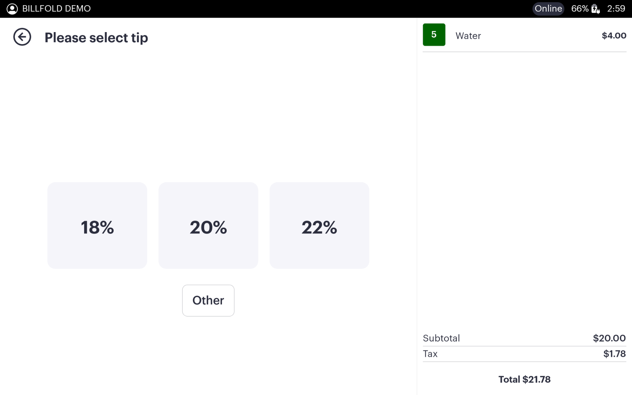 Guests will be prompted to select a tip option if the revenue center accepts tips, and then they will be prompted to fulfill payment. If tips aren't enabled, this step is skipped.