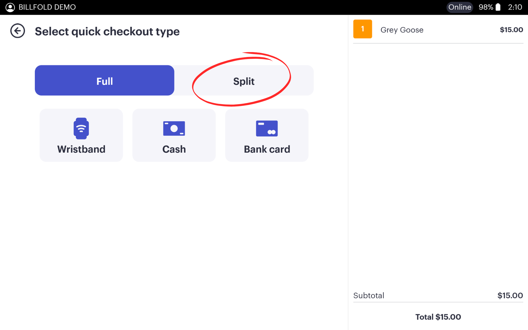 After building an order and tapping the checkout button, select “Split” at the top of the checkout screen, prior to selecting a payment method.