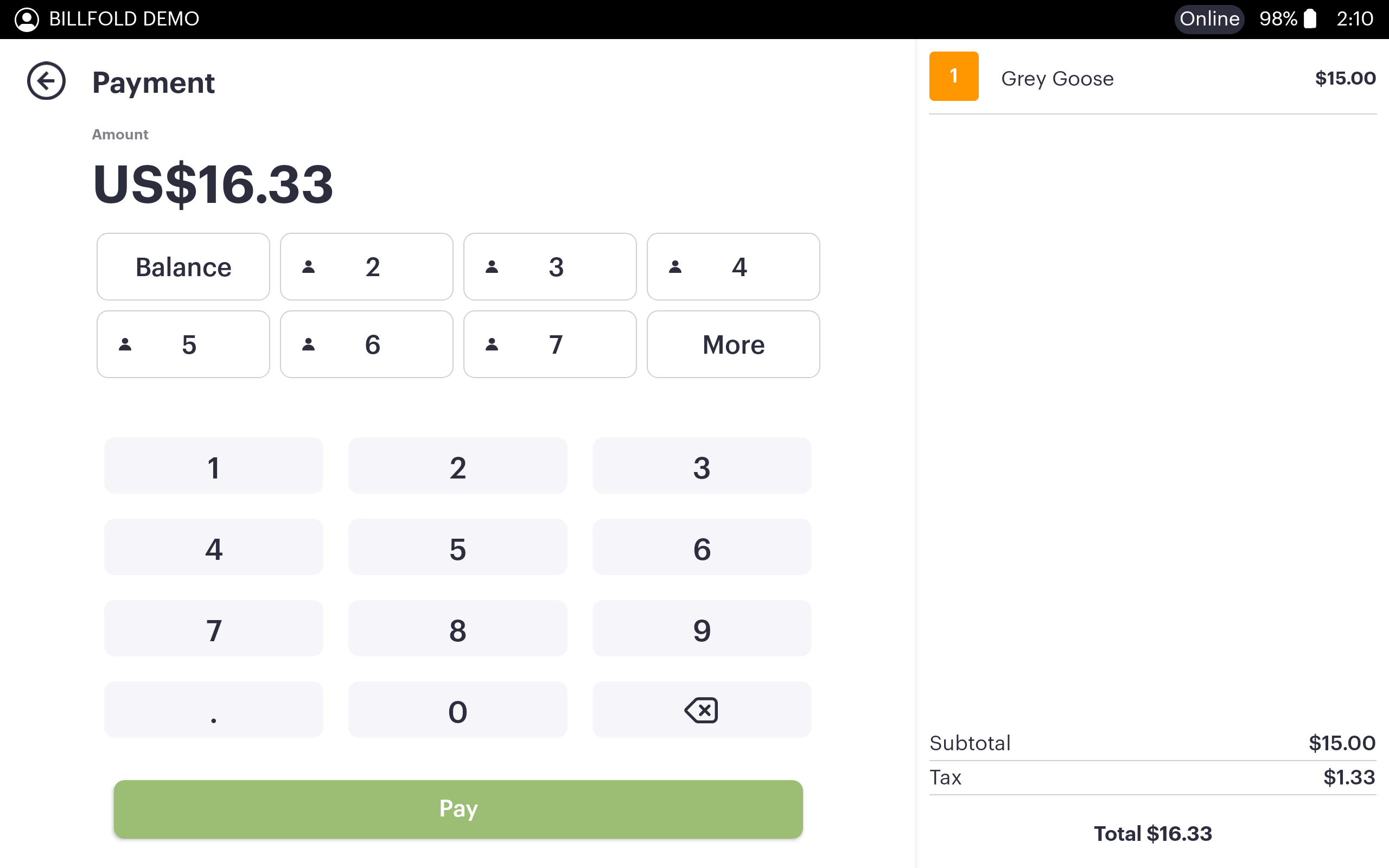 Enter the desired tender amount and tap the green “pay” button at the bottom of the screen.