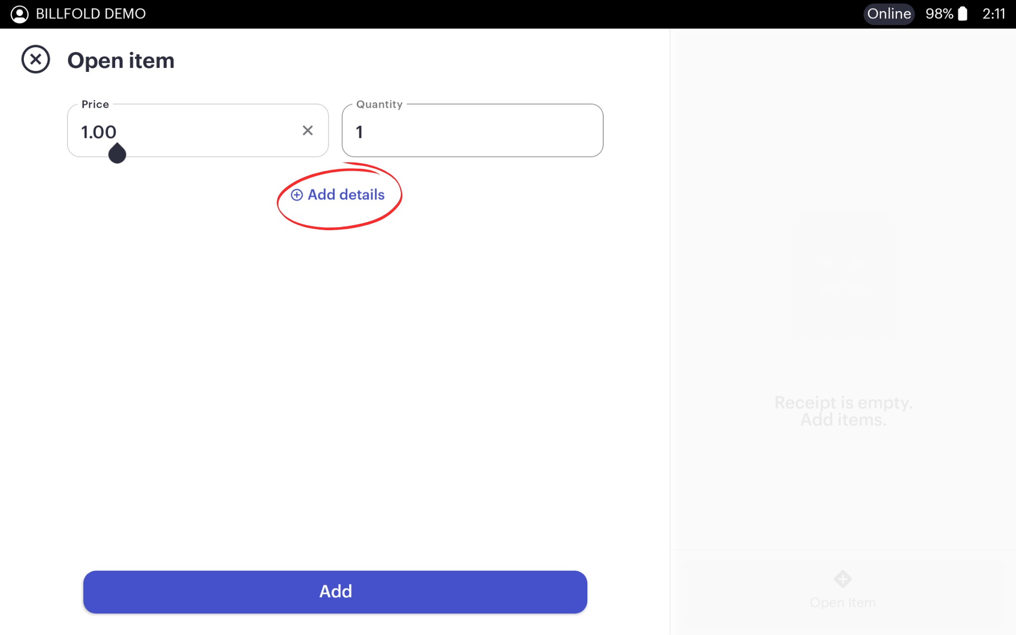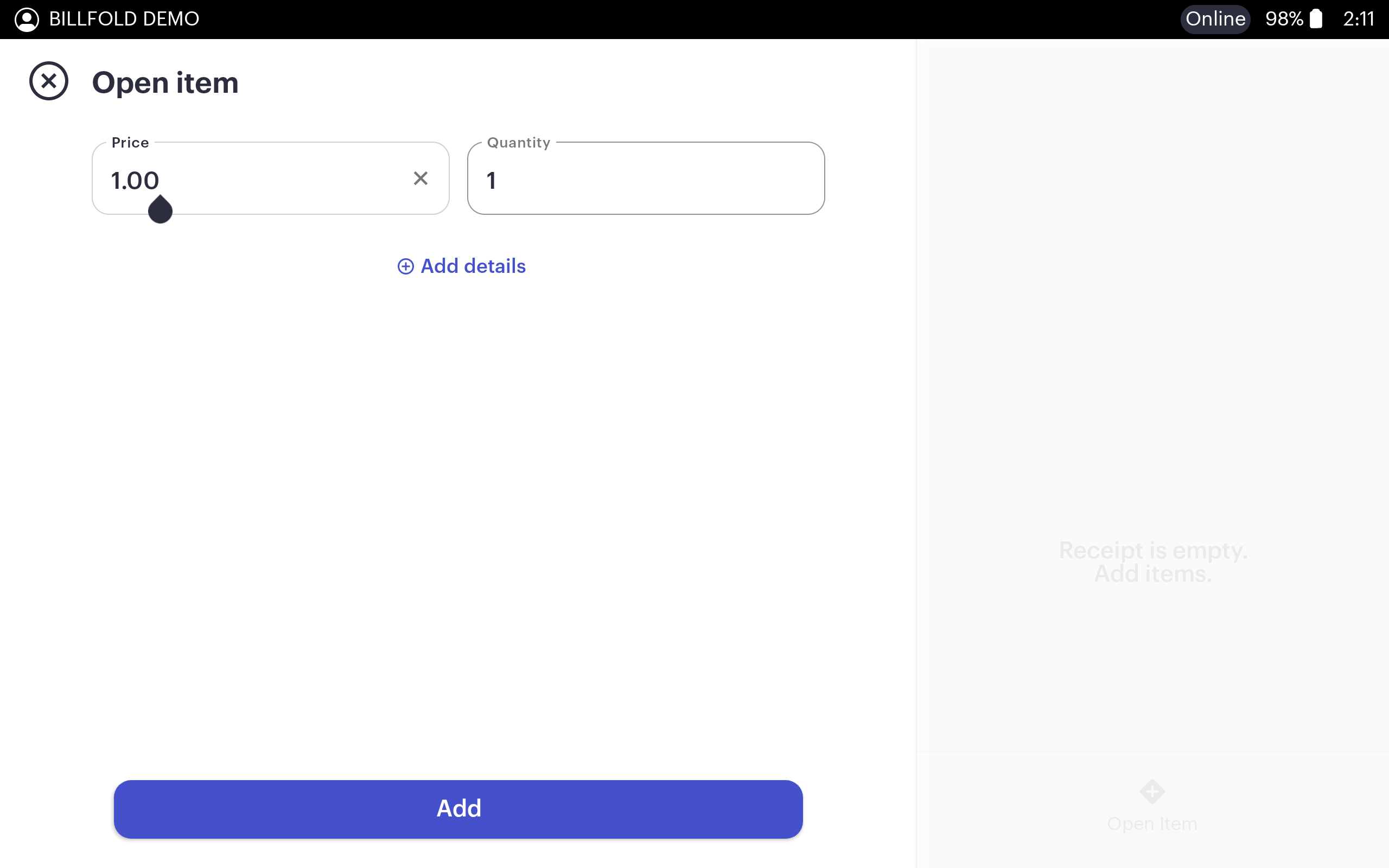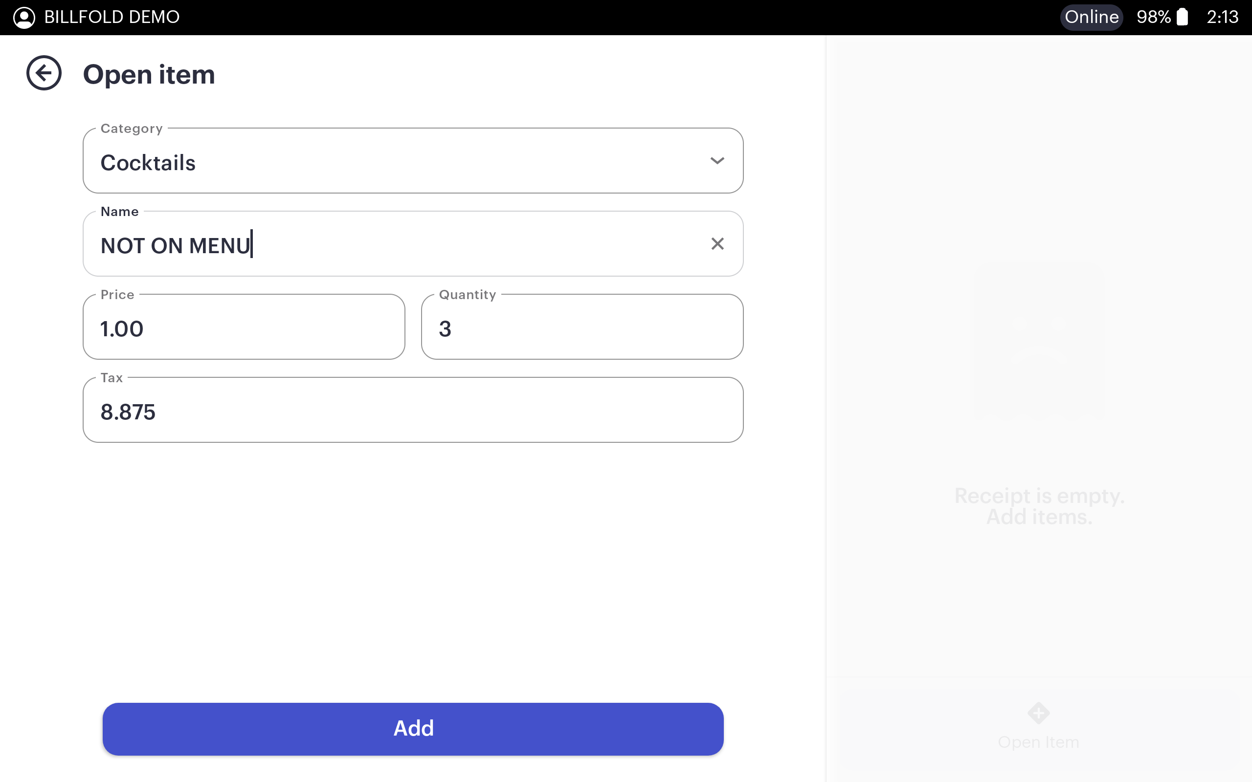 Enter the price of the item and the quantity being sold, then tap “add” to add the open item to the order cart